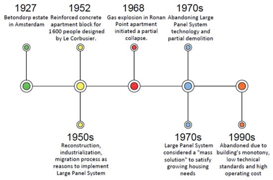 For the first time, precast concrete elements were used in the Netherlands during the construction of the Betondorp estate in the suburbs of Amsterdam in 1923–1927 []. In the year 1968, the perspective of LPS technology changed. A gas explosion in Ronan Point apartment tower in London resulted in a partial collapse of the structure that killed four people and injured 17. The causes of the disaster were the lack of alternative paths to redirect the load in case of an unexpected event and poor connections between panels []. Due to the Ronan Point collapse, building codes in many countries were updated with structural integrity or “robustness” provisions [,]. Due to the tragedy and the increasing costs of heavy transport, as early as the mid-1970s, Western countries started to abandon the construction of further facilities in large panel technology on a large scale, and later on, started the process of gradual demolition of some of them.