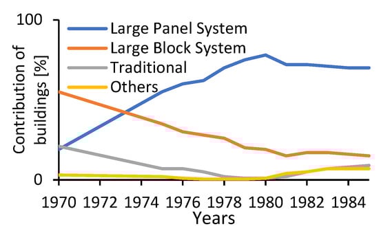 In contradiction, Eastern European countries started to use LPS technology only after the Second World War. This was justified as most of the major cities were destroyed and the industry was devastated [,]. Firstly, large block system technology (LBS) was introduced with prefabricated concrete slabs/blocks with a height of the entire storey and a width of less than 2.40 m. In the following years, LBS technology was superseded with LPS, allowing for a greater flexibility in dimensions, thus better satisfying the growing housing need. Different types of LPS technology were based on modular grid, storey height, spans and spacing []. The urbanization of Eastern Europe after World War II followed a dynamic course, completely transforming the country from rural to urban. Between 1950 and 1997, the share of urban areas in Poland has increased from 42.5% to 61.7% of total population []. Contribution of buildings per year in Figure 7 confirms that one of the key factors in dynamic urbanization was the usage of large panel system technology in construction. It can be easily noticed that with the introduction of LPS, LBS and other construction techniques began to be less and less popular. However, in the 1990s, LPS technologies were abandoned due to criticism of the building’s monotony, low technical standards of construction and high operating costs. This chapter aims to demonstrate that some LPS buildings still in use in Eastern Europe are now a similar age as when LPS buildings from Western Europe started to be demolished. If the trend will be followed, the result can be the creation of huge amounts of waste that should be, if possible, recycled and re-used.