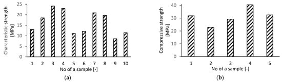 Jasiczak and Girus, in [], examined the external layer of the external wall of the edifice completed in 1986 with LPS technology (R-76, version of Rataje closed variant) with 13 overground storeys in Poznan, Poland. The thickness of triple-layer curtain wall layers were: external concrete layer of 6cm (expanded clay concrete C12/15 or standard concrete C16/20), thermal insulation of 9cm and structural concrete layer of 21 cm (expanded clay concrete C12/15 or standard concrete C16/20). The structure was transverse and longitudinal, with 4.8 m and 2.4 m spacing of load-bearing walls. The condition of concrete was determined by hardness and compressive strength. For a non-destructive test, authors used a Schmidt sclerometer. The tested concrete was in the air-dry state, and the temperature was 20–25 °C. The surface was prepared for measurement by splitting the surface layer of grit and grinding with smoothing with a wire end. Significant differences may result from conducting the test on the not-rigid-enough component (minimum thickness of the element, according to recommendations, should be 100 mm). Results are presented in Figure 10a. To determine compressive strength, the cored boreholes of 43–44 mm diameter were taken from the same structure. In order to avoid reinforcement in the samples, the location of steel rods was determined using a ferromagnetic device. For testing, a universal testing machine SATEC was used, and the results are shown in Figure 10b. Errors during construction stages, years of exploitation and poor maintenance [] resulted in a great number of scratched panels, falling grit, visible hangers and pins in the examined building. However, results regarding the state of concrete are favourable.