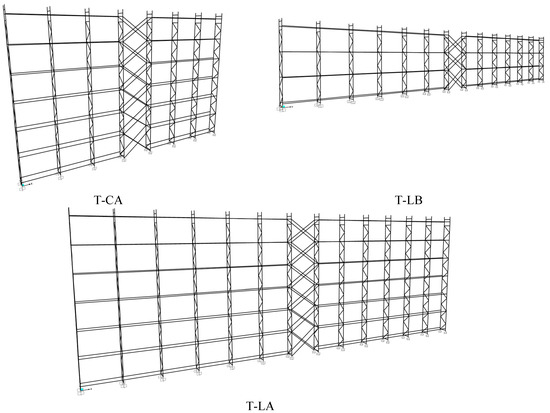 The global slenderness or aspect ratio in each direction is also discussed in this research. Slender racks are susceptible to overturning and frame distortion, which reduces their efficiency. Therefore, different global slenderness relationships were studied. The slenderness parameter was considered in cross-aisle slenderness (λCA = H/B; H = height and B = width in cross-aisle direction) and down-aisle slenderness (λDA = H/L; H = height and L = length in down-aisle direction). In Table 1, the story level (H) and slenderness parameters are shown in each archetype studied. In Figure 1, a schematic view of models assumed in numerical research is shown. CB is a type of selective rack with a short-low slenderness relationship. Two types can be obtained in accordance with a seismic design: the CB and T-CB, where the use of braced towers allows control of the lateral deformations. T-CA is a selective rack with a short-high slenderness relationship; T-LB is a selective rack with a large-low slenderness relationship; and T-LA is a selective rack with a large-high slenderness relationship. The prefix T is used to specify the use of braced towers.