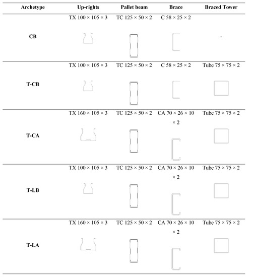 Summary of dimensional properties of rack members and type of archetype (dimensions in millimeters).