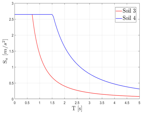 To quantify the seismic demand, the two zones with higher maximum effective acceleration were used (Zone 2, Ao = 0.30 g and Zone 3, Ao = 0.4 g) and the two types of soil with higher amplification were considered (soil type 3 and soil type 4), according to [2]. The response reduction factor R = 4 is used for all models [2] and the design spectrum with R = 1 is shown in Figure 3.