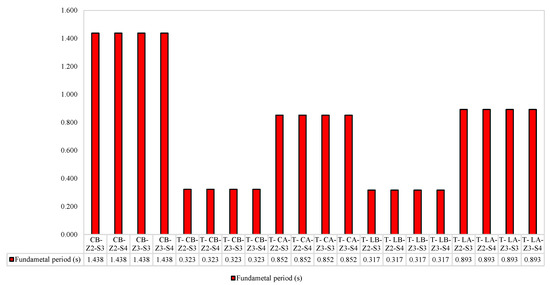 In Figure 11, the results of the fundamental period according to SA are shown for CBZ3S3 models. The QL input variable generated a notorious perturbation in the analysis performed. This behavior was observed in all models. The variation of H parameter generated a perturbation in inter-story drift and base shear, for the down-aisle direction. However, the values do not follow a clear trend. In Figure 12, the results of the fundamental period according to SA are shown for CBZ3S4 models. Uniquely, the soil type was modified (S3 to S4). The QL input variable generated an important perturbation in the analysis performed and achieved a strong tendency. This behavior was observed in all models. All other parameters do not follow a clear trend. From the results obtained, a specific evaluation of the input parameter Ms without varying the QL loading is performed, to identify its influence on the most affected models (see Section 5).