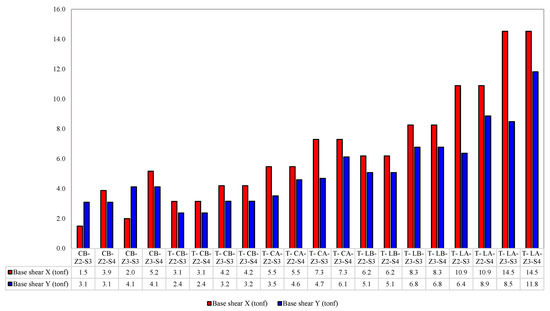 In Figure 9, the results of fundamental period according to SA are shown for CBZ2S3 models. The QL input variable generated a notorious perturbation in the analysis performed. Therefore, this is the variable that most affects the behavior of the short-low models studied. In this sense, the live load controls the dynamic behavior of the structure, such as the period (T = 2π√(M/K)—if the mass increases, then the period increases. This behavior was observed in all models. Although the H and L parameters were varied in the models, the influence on the output parameters does not follow a clear trend. On the other hand, a slight perturbation was observed when the Ms parameter increases according to “Base shear Y” parameter output. However, the fit of the values was not so clear.