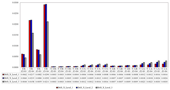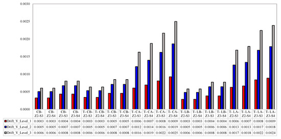 In Figure 6, the inter-story drift ratio in the down-aisle direction is shown. All values obtained meet the limit established in [12], except for models designed with soil type 4. In addition, models without bracing towers and soil type 4 reached a displacement increase of up to 4 times the displacements observed in models with soil type 3, regardless of the seismic zone. On the other hand, comparing racks with bracing towers and low-high, the maximum drifts are achieved in the upper levels. This phenomenon is more evident when global slenderness increases, as observed in the high-rise models. In Figure 7, drift values in the cross-aisle direction are shown. All values are less than the limit established in [12]. Moreover, all models achieved similar drift values when the global slenderness ratio is low. Rack models with high slenderness ratios reach drifts up to 7 times more than the rest of models. This is independent of soil type, seismic zone, and rack length.