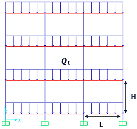 The application of sensitivity analysis was performed using an open-source tool called SAFE, developed by [38]. For this purpose, rack-type structures were modeled in [32], and the programming interface developed by the authors was used to generate a routine test using MATLAB software [39] that optimizes the modeling and analysis process. The models studied are those from the seismic design of the five archetypes of single-depth selective racks. The model input variables are classified into geometric and design variables (see Figure 8). Among the geometric variables, the column height (H, with a variation range of 1.2–2 m) and beam length (L, with a varied range of 1.5–3 m) were considered, while the design variables were the live load (QL, with a varied range of 0.1–1 ton), which is distributed on each beam, and the seismic mass (Ms) associated with the fraction of load to consider in the seismic analysis.
