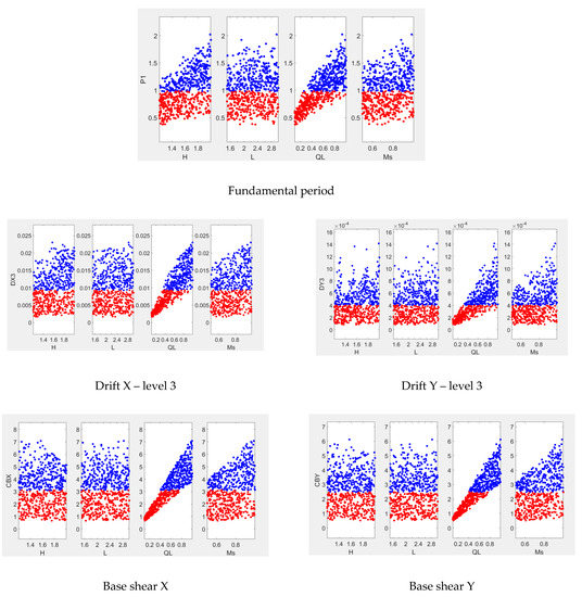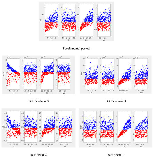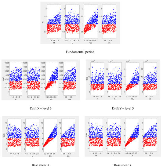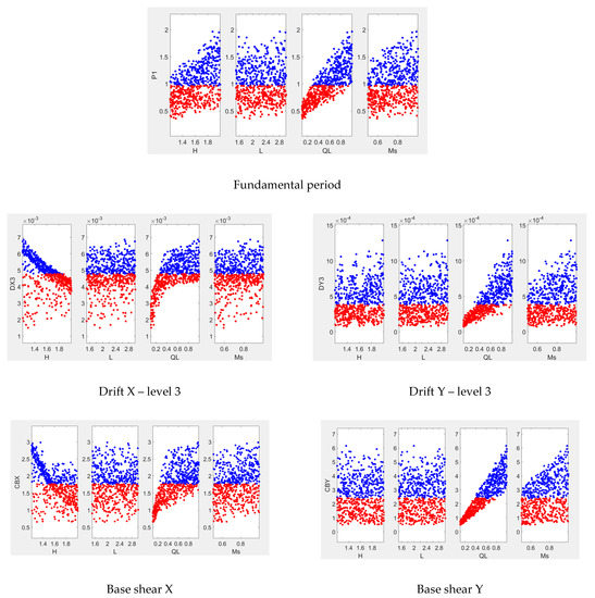 In this research, a sensitivity analysis was performed to establish the relationship between the input variables and the output variables, with different models to understand the influence of the variables in the seismic design of racks. Sensitivity analysis allows for study of the variation in the outputs of a numerical model. There are several reasons for performing this type of analysis. In general, a ranking of the different input variables is performed to identify those that have the greatest influence on the outputs. Subsequently, the domain of values of each input variable that produces significant changes in the output values is plotted, known as mapping. For this purpose, regional sensitivity analysis (RSA) was used, which was initially proposed by [36,37]. This method consists of dividing the samples into “Behavioral Models” (BM) and “Non-Behavioral Models” (N-BM). The BM is identified with a red color and the N-BM are identified with a blue color. Values below the median are considered BM, and values above the median as N-BM. The above classification depends on whether or not the output exhibits expected behavior or is well within a predefined threshold.