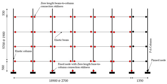 An additional parametric study is conducted using OpenSees software [40] to analyze a simplified model. The simplified model is configured in 2D, with four levels and material properties similar to those used in previous models. A modal response spectrum analysis was also considered. The model chosen represents the higher flexibility between the models previously analyzed, since the models with higher stiffness have less probability to enter resonance in soft soils such as S3 and S4. The model was calibrated from the previous SAP2000 models in terms of fundamental period and modal shapes, as shown in Figure 13. To consider the P-Delta effect, an additional column has been considered at the end of the structure, with a pinned base and connections and loaded with the entire load by level.