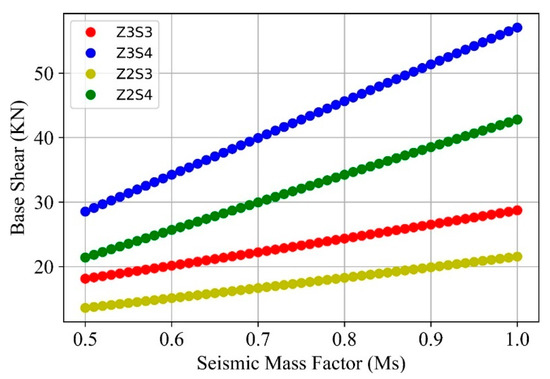 In Figure 14, an increase of fundamental period as an increase of seismic mass factor was obtained. This behavior can be obvious; however, it is necessary to verify the proportion and the degree of the relationship, which, to date, has not been studied. The linear relation achieved can be affected if braces are used in the down-aisle direction. In Figure 15, the relation between base shear and seismic mass is shown. In this sense, a higher influence of the Ms factor in models analyzed for soil type S4 was obtained. The values of the slope curve are reduced if a better soil type is considered. Therefore, the base shear is dependent on Ms factor for steel racks located on soft soils.