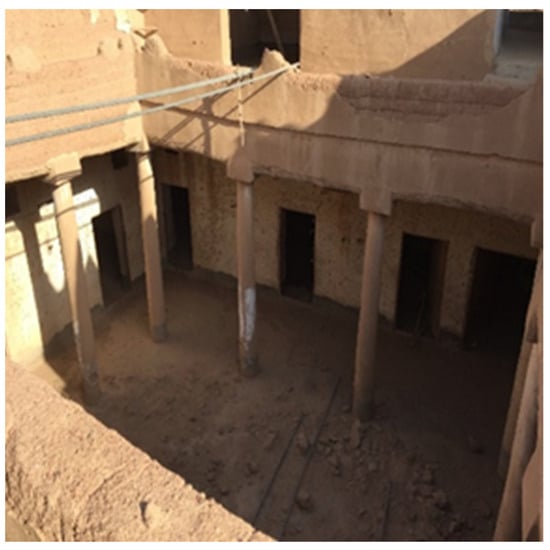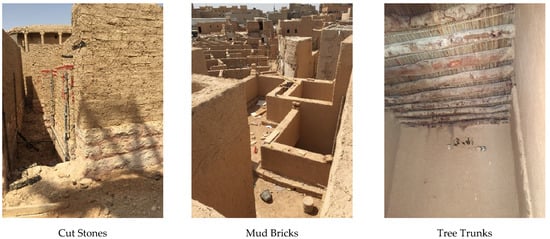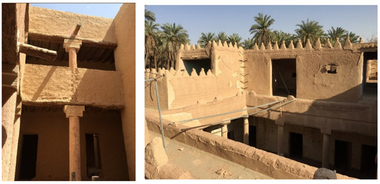 Stone was scarce in the Najd region, so mud was used to construct the sun-dried bricks expended in the houses. Mud was also used as a plaster for the outer and inner parts of the walls since it was suitable for the sandy environments [13]. The primary building materials in Najd construction were mud (known as Libin), cut stones for the basement, palm tree trunks for the roof, and straw (see Figure 2). This was carried out by master builder Al-Moualem and his family, neighbours, and relatives [6].
