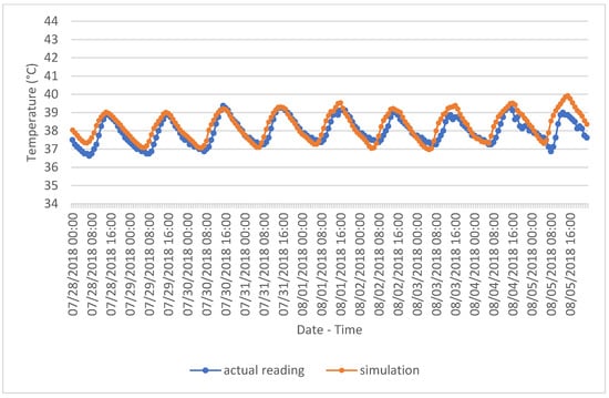 The information on internal weather conditions was gathered for a variety of locations with distinct uses and, consequently, unique architectural elements. Three rooms on the first level and three rooms on the second floor each had an internal temperature logger. Additionally, the loggers were positioned away from the entrance in the middle of the room’s ceilings. Despite this, the logger’s data were impacted by open windows and doors since the air change exhibited hourly oscillations. To ensure open access to climatic influences, weather stations were also erected on the building’s roof and placed on uniquely engineered platforms, lifting the weather station above the surface of the roof to allow for the uninterrupted collection of weather data. To record the sun’s movements, solar radiation sensors were positioned south. This paper used Design Builder software to display architectural and construction details. In the summer of 2020, real data were used to validate the temperature calibrations. This validation was a first step towards understanding passive strategies for the future analyses of traditional houses in the cities of Riyadh and Hail, which was the main motivation for using these models. As seen in Figure 3, regarding the software temperature calibration, the measurements and the validation model results in Riyadh city were almost identical, with a 3.16 per cent difference on average between the measured and model results. Similarly, Figure 4 shows the simulation results for the traditional house model in Hail city, indicating an average difference of 0.84 per cent between the measured temperature and that predicted by the simulation.