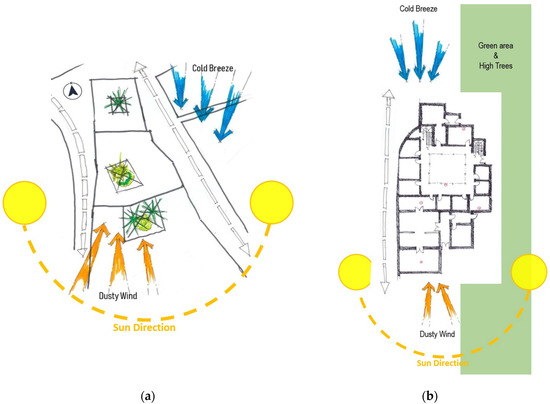 An architectural site analysis was conducted to create design policies that incorporate harmonious design, and these are undertaken regularly to determine their potential impact on design conditions in the present and future [23]. In the present study, site analyses of traditional houses were used to ascertain how their architectural principles could be acclimated to contemporary house projects. These site visits provided useful information about the architectural features and environmental principles of vernacular construction in Najd. For a complete understanding of the site context, a range of factors should be considered: green areas, traffic conditions, zoning, size, topography, and building development. As part of the site analysis, this researcher identified and examined the wind direction and sunlight, while these factors were also included in the site drawings of Case 1 and Case 2 (see Figure 5a,b).