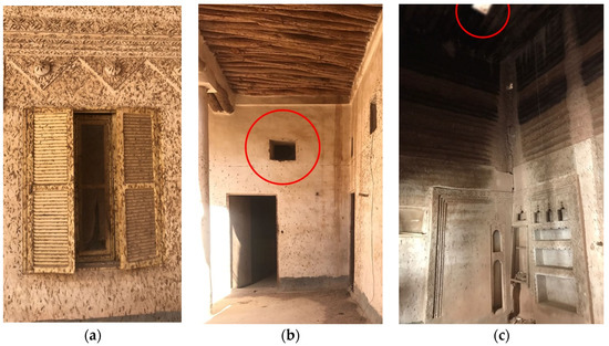 In vernacular architecture, the purpose of windowless exterior walls is to prevent direct vision from the outdoors to the interior, as well as to prevent dusty winds from entering the space. Moreover, how the WWR is positioned in each space is determined by the type and direction of openings within the building. As determined by the architectural analysis, three types of openings were used in Najd vernacular architecture:
