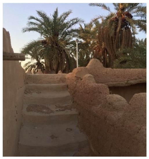 Traditional houses in Saudi Arabia are noteworthy examples of vernacular architecture today. For example, houses in the Najd region are designed according to the culture and traditions surrounding central Saudi Arabia. Despite many common characteristics, Saudi houses in each region have been developed based on the local climate and geography, and are thus differentiated from each other through the form, scale, and size of the building, as well as by the materials used and the surrounding environment. Saudi Arabia is a huge country extending from the south to the north, which means there are several climatic zones and diverse topographic features. Therefore, different parts of Saudi Arabia have different climatic conditions, although the desert encompasses approximately 90% of the overall area of the country [4]. The present research identified the most significant geographical areas in Saudi Arabia that have hosted many Arabic civilizations. There are four provinces in present-day Saudi Arabia, the largest of which is the Najd Plateau; this area is almost the size of France, with a surface area of about 700,000 square kilometres, accounting for about a third of Saudi Arabia’s total territory [5]. Despite the diversity of desert architecture, Najd architecture may appear simple (see Figure 1); nevertheless, it is significantly differentiated by its focus on modifying the severe desert conditions [6]. Historically, Najd Houses represented the practical wisdom and spirituality of the locals. Najd houses were originally built in two areas with a courtyard in the middle. Besides providing shelter from the weather, they also enrich safety. The courtyard houses of the Najd region comprised square or rectangular dwelling spaces with two or more floors and also had other rooms that could be used for public or private purposes [6]. The courtyard was not only a type of shelter but was also considered to be a spatially responsive geographical area since it provided a contemporary blend for long-lasting urban development [7]. Courtyards in urban areas may include gardens on the inner side, which Akbar [8] indicated usually included simple trees or plants.