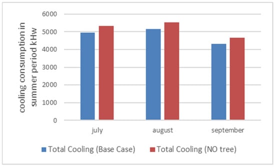 The simulation results demonstrate that long tree strategies positively contribute to the total cooling energy output during the summer period since they maximize the cooling effect, resulting in significantly reduced outdoor temperatures and relative humidity levels. According to the simulations, cooling energy consumption for a traditional house in Hail city rose by up to 3.9% when the weather file was modified. Taking into consideration the weather conditions for Case 3, which did not use long trees, the researcher modified the weather file for Case 2. To account for the entire summer of 2020 (Figure 14), the simulation was conducted over three months.