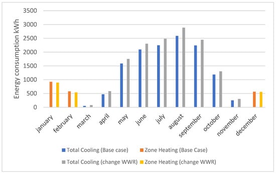 In Hail city (Case 2), the total annual energy consumption increased by approximately 3.8% (Figure 16). During the summer, more than 1200 kWh are redacted. The increase in WWR will result in an additional 870 kWh of total cooling and heating usage over the summer’s four-month adverse weather period (June to September). However, because it will allow the sun’s rays to enter interior spaces directly, the rise in WWR has a favourable effect on the amount of heat consumed during the winter.