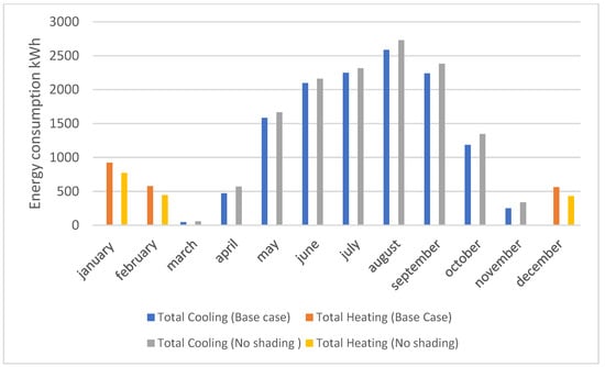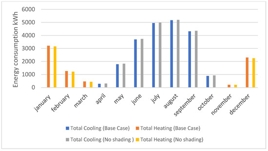 Figure 20 illustrates the negligible influence of the shading device on the design for Case 2 in Hail city. When the shading device was removed from the simulation model, energy consumption increased by 0.3%. This indicates that the shade device has a negligible impact on the energy used for cooling in a standard home in Hail City, saving up to 220 kWh during the summer. On the other hand, the use of shading devices will increase the need for heating during the winter season. Termination of the shading device will result in savings of about 2.5% in overall heating use.