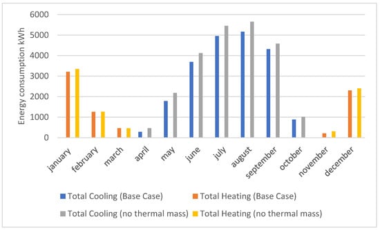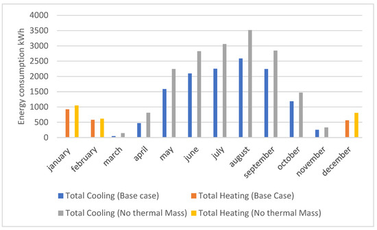 The annual energy consumption for Case 2 with modified thermal mass wall to imitate the contemporary house’s exterior wall structure.