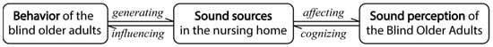 In this study, human, equipment, and environmental sounds were revealed as common sound sources in nursing homes [52,69,70,71,72,73]. Some of these studies found that staff sound was a major sound source in nursing homes, accounting for, for example, 26% [69] or 34% [72] of the total sound. However, the current study revealed that the staff members at the nursing home had already tried their best to avoid making noise around blind older adults so as to not confuse the information, as one staff member stated that “staff greet each other with as little noise as possible (aa78)”. In addition, the nursing homes set up the informational sound at the spatial nodes to provide assistance for the blind older adults, and blind older adults were more dependent on electronic devices for leisure activities. The nursing home that we investigated had more informational and equipment sounds, and fewer staff sounds, than ordinary nursing homes. In conclusion, the daily behavioral activities of the blind older adults generated the massive human sound; the building site environment brought the environmental sound to nursing homes; as such, the normal operation of nursing homes and the equipment and machinery supporting the residents produced equipment sound. And the architectural spaces of the nursing homes helped the blind older adults accomplish the daily life behavioral activities, and these sounds were both indispensable and unavoidable. Meanwhile, exploring the sound perception of the blind older adults in nursing homes helped to understand the impact of these sounds on blind residents.
