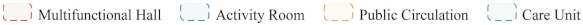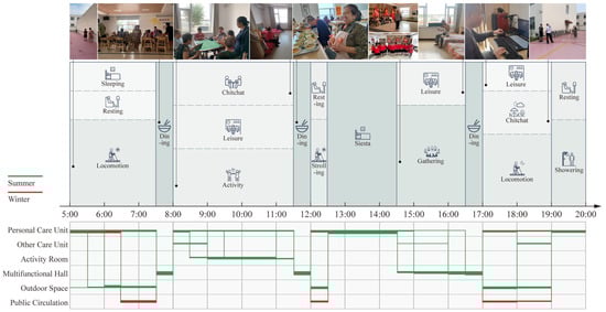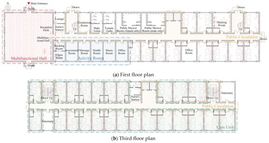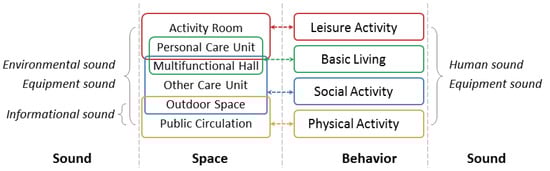 According to the behavioral findings in Section 3.1, the daily behavioral activities of blind older adults in nursing homes can be categorized into basic living activity, leisure activity, social activity, and physical activity [56]. As shown in Figure 7, firstly, the basic needs of the blind older adults were met in the care unit (living) and the multifunctional hall (food) in the nursing homes; secondly, their leisure and recreation generally occurred in their personal care units or activity rooms, while social activities mostly occurred in the multifunctional hall, outdoor space, and others’ care units; finally, the physical activities occurred in the outdoor space and public circulation of the nursing homes.