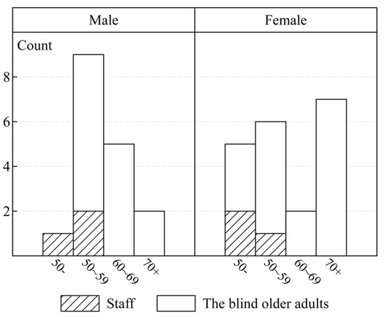 The definition of blindness was based on the criteria in Chinese National Standard on Disability Classification and Classification of Persons with Disabilities [57]. Two field interviews were conducted on 21 July and 28 December 2021, followed by the two behavior observations on the next days, respectively. And the data from 37 interviews and the basic information of the participants were collected, as shown in Table 1 and Figure 3. In order to not cause psychological stress to the blind older adults and to reduce their vigilance, the researchers were introduced by the nursing workers into the care units, to explain the purpose of the study and obtain the consent of the participants before conducting the interviews. The interviews were relayed and recorded. In accordance with local legislation and institutional requirements, this study was ethically reviewed by the Harbin Institute of Technology. Afterwards, the interview data were coded, induced, and clustered based on classical grounded theory [58,59,60,61,62,63] to construct a sound perception model of the blind older adults in nursing homes.
