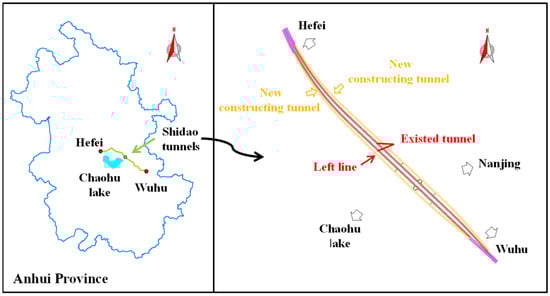 Shidao tunnels are twin tunnels and located at the east of Chaohu lake, Anhui province in eastern China. The tunnels are the critical nodes of the expressway connecting two cities of Hefei and Wuhu, as shown in Figure 1. The existed tunnels were constructed and put into operation since 1996. The two-lane expressway could not meet the requirement of the rapid increasing traffic, so an expansion project of Shidao tunnels was planned. Two new tunnels marked by yellow lines were decided to be built outside of the existed twin tunnels, which are presented in red lines in Figure 1. The lengths of the left line and right line of the new constructing tunnel are 1220 m and 1230 m respectively. Horizontal spacing between the new constructing tunnel and the existed one is 38.2 m approximately. Due to the symmetry of these two lines, the left line is selected to be studied in the study.
