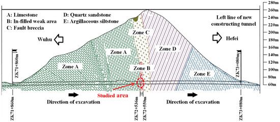 Zone A is composed of relatively complete and high-quality limestone, so the tunnel is excavated by drilling and blasting method and bench cut method. When close to zone B (ZK 72 + 530 m), altering with center diaphragm (CD) method, the new tunnel is excavated, which can reduce the rock disturbance caused by excavation and is suitable for large-span tunnels in weak surrounding rocks []. The excavation surface is divided into four parts. Each part is excavated by small mechanical or hand in sequence and supported with primary lining, bolts, and temporary middle wall. After a proper excavating interval of 4~5 m, the temporary middle wall is removed and then the second lining and inverted arch are installed. Zones C, D, and E are also excavated by drilling and blasting method and bench cut method because of the relatively good properties of rock strata in the three zones.