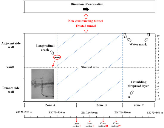 The existed tunnels had been completed for almost 20 years when the new tunnel was constructed. The apparent image and outline characteristics of the existed tunnel lining are collected through the automatic detection equipment. By identifying the apparent defect information, it is found that there are water marks, a crumbling fireproof layer, and a longitudinal crack in the existed tunnel between ZK 72 + 520 m and ZK 72 + 560 m, as shown in Figure 3. It is worth noting that the longitudinal crack is located at ZK 72 + 530 m, which is close to the in-filing weak area zone B and may be greatly affected by the excavation of zone B. Therefore, the variations of this crack width are measured by deformation strain gauge during the excavation of the new constructing tunnel, especially when zone B is excavated.