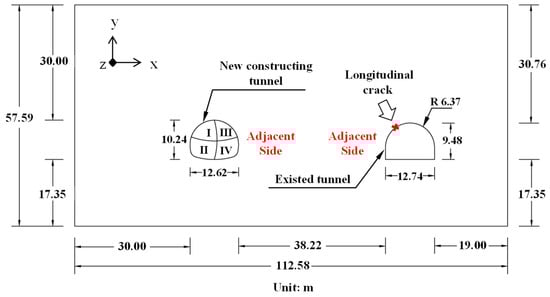 Since the symmetry of the Shidao tunnels, the new constructing and existed tunnels of lift line are selected for numerical analysis. The longitudinal length of the numerical model is 20 m of the studied area. In order to simplify modeling and calculation process, the plane sizes of tunnels model and rock mass model are determined, as shown in Figure 4. New constructing tunnel has the vertical size of and horizontal size of 10.24 m and 12.62 m, while that of the existed tunnel is 9.48 m and 12.74 m respectively. The distance between these two tunnels is 38.22 m. The dimension of the rock mass on the right side of existed tunnel is 19 m, half of the distance between the two existed tunnels, and on the left side and the upper side of new constructing tunnel are both 30 m.