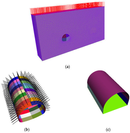 Numerical model. (a) meshed tunnel model; (b) supporting structures of new constructing tunnel; (c) supporting structures of existed tunnel.