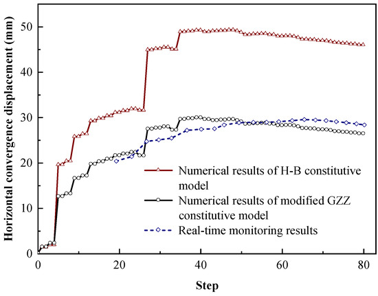 The horizontal convergence displacement of the side walls of new constructing tunnel at ZK 72 + 530 m is selected as the index to validate the numerical study. After the excavation and initial support of part III, real-time monitoring is conducted using a displacement gauge (JSS30A). The real-time monitoring displacements are compared with the numerical results using modified GZZ constitutive model and H-B constitutive model, as shown in Figure 7. It is obvious that the numerical analysis result of modified GZZ constitutive model is closer to real-time monitoring results. The numerical analysis result of H-B constitutive model is approximately twice as large as that of modified GZZ constitutive model. The main reason for this difference is that the H-B strength criterion does not account for the effect of intermediate principal stress, which might affect the strength of the rock mass and, as a result, the accuracy of H-B constitutive model [,,]. In detail, the final horizontal convergence displacement obtained by numerical analysis based on H-B constitutive model is 46.0 mm, and that based on modified GZZ constitutive model is 26.5 mm.