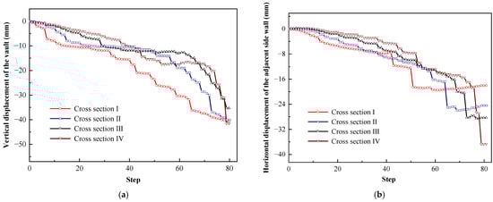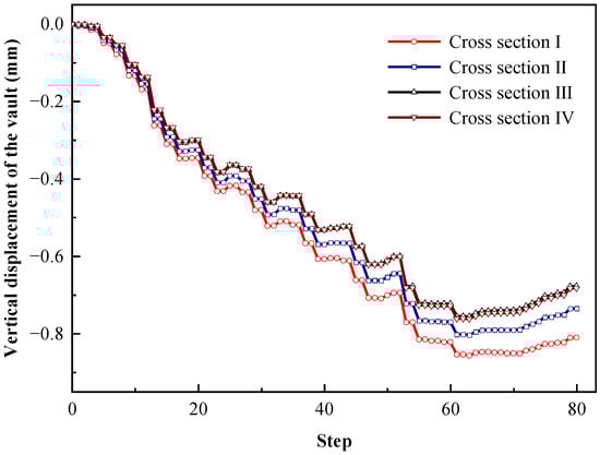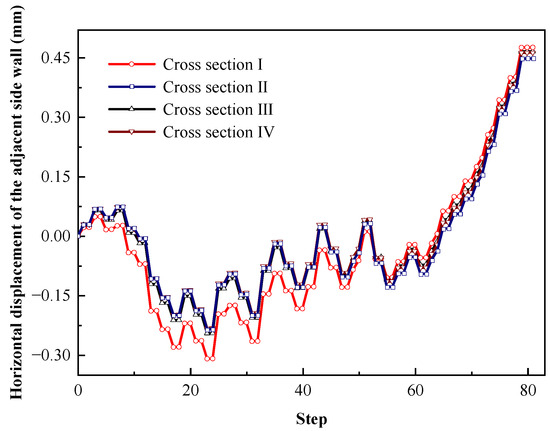 The vertical displacement of the vault at cross section I, II, III, and IV of existed tunnel is presented in Figure 11. The developed trends of the four cross sections are remarkably similar, and their values are also not much different. The maximum difference of is 0.15 mm. Due to the excavation of different parts of new constructing tunnel, it is shown that the displacement has a certain degree of fluctuation during the constructing process, but has no influence on the overall trend. In detail, vertical displacements of the vault of four cross sections increase in the early period of construction, and then reach the maximum near the same construction step 60. Among them, the value of cross section I is the largest, which is approximately −0.88 mm. At the end of construction, the vertical displacement of the vault slightly rebounded. Taking the cross section IV as an example, the final rebound of the vertical displacement of the vault is about 0.08 mm. This is related to the horizontal displacement of the adjacent side wall of new constructing tunnel, which also has an induced rebound as shown in Figure 8b.