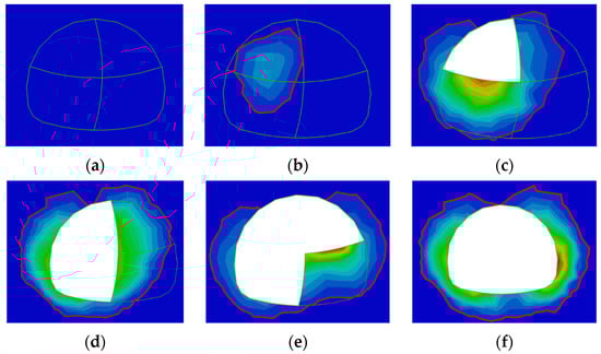 Development of the plastic zone. (a) step 43; (b) step 46; (c) step 54; (d) step 60; (e) step 76; (f) step 80.