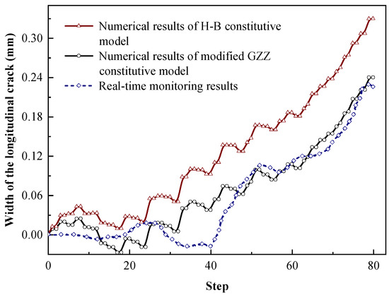 The numerical analysis was carried out using modified GZZ constitutive model and H-B constitutive model respectively. The vertical deformation differential between two nodes adjacent to the crack is defined as the width variation of this longitudinal crack. The width of the longitudinal crack is measured in real-time as introduced in Section 3.2. The results of both numerical analysis and real-time monitoring are illustrated in Figure 10. Since further expansion of the existed crack requires overcoming the tensile strength of the lining, it can be seen that there is a buffer stage at the beginning of excavation during which the crack width remains almost constant. In addition, in contrast to numerical analysis result, the real-time monitoring result has a certain lag effect in the early period of excavation. This is because the deformation of the surrounding rock and the change of the stress field caused by excavation of new tunnel will take some time, rather than be affected immediately as numerical simulation. In the later period of excavation, the modified GZZ constitutive model well reflected the width development of the longitudinal crack compared with that of H-B constitutive model.