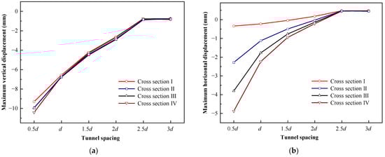 Relationship between tunnel spacing and displacements. (a) Maximum vertical displacement of vault; (b) maximum horizontal displacement of adjacent side wall.