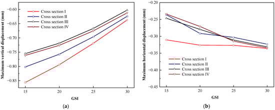 Geological conditions can be evaluated quantitatively using GSI. In order to investigate the influence of different geological conditions, four GSI of zone B are discussed in this section which are 15, 20, 25, and 30, respectively and the geological parameters of zone A remain unchanged. The maximum vertical displacement of the vault and the maximum horizontal displacement of the adjacent side wall for the existed tunnel are shown in Figure 14.