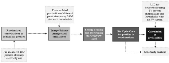 The following methodology section presents the detailed step-by-step process needed to calculate profitability of shared PV systems (Figure 1). Using Visual Basic Applications (VBA) in MS Excel, electricity use profiles were combined randomly using a database with pre-measured electricity use from 1067 households. A more detailed description of the profiles is given in Section 2.1. The household electricity profiles in each combination were further matched with PV supply that was simulated using System Advisor Model (SAM) software [17]. Additionally, based on the electricity balance calculations (Section 2.5), an electricity trading scheme was applied to simulate the exchange of electricity among prosumers (Section 2.6). Further on, LCC was calculated in three cases: households sharing a PV system within communities of different sizes, owning a PV system without sharing it, and without a PV system. The LCCs were further compared to determine the profitability for each household in different situations (sharing, not sharing, and without a PV system).