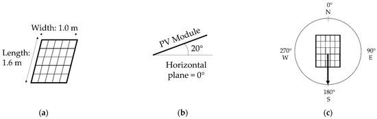 Since the main objective of this research was investigating the potential of sharing PV systems, it was necessary to assume that each household within a community had the same PV system size and configuration (modules’ tilt and orientation). Using SAM software, the supply of several PV system sizes was simulated and then manually compared to the demand of every single household electricity profile in the database. The electricity savings provided by the supply of each system was compared to their cost. The aim of this comparison was to identify the range of PV system sizes that would present the highest financial benefit above others. Based on that, four PV sizes (0.25 kWp, 0.5 kWp, 0.75 kWp, and 1 kWp) were further analyzed and presented in this paper. The PV systems consisted of modules with 20% efficiency and dimensions of 1.6 m × 1.0 m (Figure 2a). The modules were tilted at an angle of 20° (Figure 2b) and with an azimuth of 180°, which corresponds to the south orientation (Figure 2c). This configuration can be found as a recommendation for flat roof buildings by Swedish solar panel retailers [22,23]. The tilt of the module is lower than the optimal tilt for Swedish locations (around 40°) to maximize the number of solar panels in the roof space without the panels shading each other.
