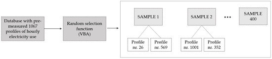 All household profiles from the initial database were included in a randomization process. By using a random selection function, the necessary number of participants was grouped into one combination by randomly selecting profiles from the available database of 1067 electricity use profiles (Figure 4). The total population of profiles was considered for selection in every independent run of the randomization process, so previously selected profiles were free to be selected for multiple runs. The randomization was finalized by creating a database with all created combinations.
