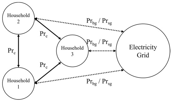 A price model proposed by previous research [15], the so-called mid-market rate, was used in the calculation of the electricity cost for a household trading electricity within a community. The electricity trading method and equations developed in this paper were based on previous research [15]. Considering the electricity user’s perspective, three prices were considered in the model: the hourly price to buy electricity from the electricity grid (Prbg), to sell electricity to the electricity grid (Prsg), and the hourly price of buying or selling electricity from and to other households (Prc). In the model, Prc is assumed as the average of Prbg and Prsg. Figure 6 shows the price scheme with an example of a three-household community trading electricity.