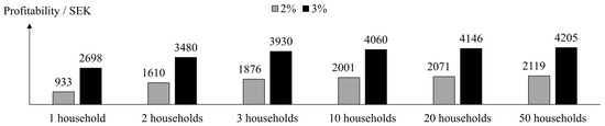 In this section, profitability results were analyzed over a period of 40 years, and it does not consider the tax reduction benefit. Figure 8 shows the average household profitability in combinations of 1, 2, 5, 10, and 50 households, with a 0.25 kWp system per household. The results were displayed for scenarios of electricity price growth of 2% and 3%.