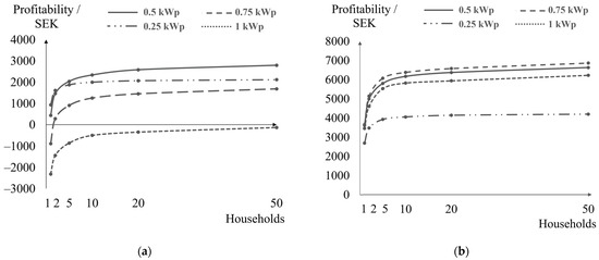 - The profitability of households was higher when they share electricity in larger communities. The study confirmed that, by sharing electricity with more households, the most profitable PV system’s size increases. However, it mostly affected smaller communities where the difference in profit was larger.