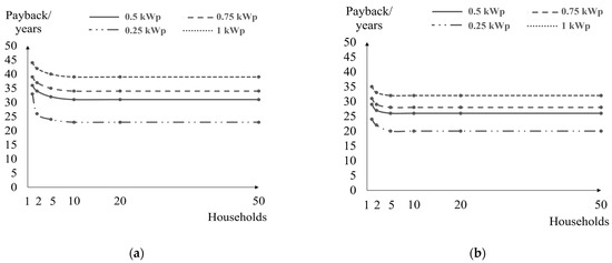 Figure 10a shows the payback results for electricity price growth of 2%. It was noticed that the system’s payback can be reduced by up to 10 years when a household is sharing a PV system in a combination of five or more households. In Figure 10b, a reduction was also seen for the electricity price growth scenario of 3%, wherein the system’s payback can be reduced by up to 4 years. Moreover, for all four PV systems, the payback curves started to flatten after five-household combinations, presenting the same payback period in combinations of 10, 20, and 50 households.