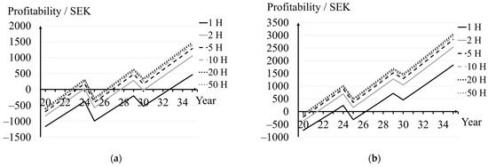 In Figure 11a,b, average household profitability was analysed over the years to explain the difference in payback reduction between different scenarios of electricity price growth. In the analysis, the payback is represented by the year when the PV system becomes profitable for the first time. Recurrent costs such as the change of the inverter in the 30th year (Figure 11a,b) and the change of the module in the 25th year (Figure 11b) cause financial losses. Given that, more time is needed for a PV system to become profitable. It was observed for an individual PV system (1H) with an electricity price growth of 2% (Figure 11a) that profitability drops in the 30th year when the inverter is exchanged. After that year, profit is again achieved, making the system reach its payback in the 33rd year. The same case with an electricity price growth of 3% (Figure 11b) reaches its payback after 23 years, which is before the 25th year when PV modules are exchanged. As a consequence, the difference in payback time between an individual system and a shared system is smaller when considering an electricity price growth of 3%.