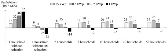 Furthermore, the tax reduction benefit was implemented for the cases of households owning an individual PV system. Figure 12 shows the average profitability, wherein one household was compared in two situations: with tax reduction and without tax reduction. When considering the tax reduction benefit, one household presents higher profitability with any system size when compared to other cases without the tax reduction benefit. The only exception was for a system of 0.25 kWp, wherein it was more profitable when shared with other households.