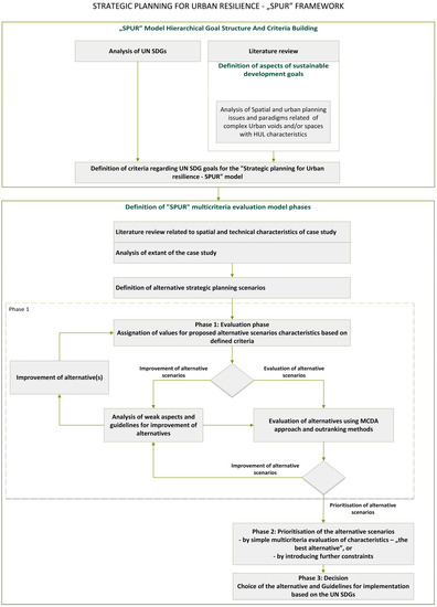 After the research questions had been asked, the work phases and workflow were defined, resulting in a holistic Strategic Planning for Urban Resilience, i.e., the SPUR model (Figure 2). The model consists of two major parts focusing on establishing a hierarchical goal structure and conducting multi-criteria decision analysis.