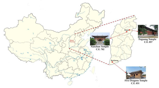 All the preserved Tang Dynasty timber-framed buildings are located in Shanxi Province, China (Figure 1, Table 1). There are several reasons why they were preserved: Shanxi is located in the north and has a dry climate, which is very suitable for the preservation of timber-framed buildings. Termite infestation was also avoided. Secondly, it is isolated from other areas, which prevented damage from war. Thirdly, the buildings are all small in size, and there was very slow economic development of the places where the old buildings have been preserved, and hence, they have not been overdeveloped.