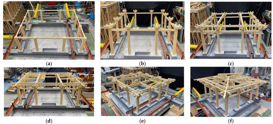 Assembly process of the Nanchan Temple model (produced by the authors). (a) Placement of columns and Lan’E. (b) Placement of column head Dou Gong. (c) Placement of Da Liang and Zhutou Fang. (d) Placement of second floor Zhutou Fang and other components. (e) Placement of Jiao Bei, Cha Shou, and Tuo Feng. (f) Placement of upper beam frame.