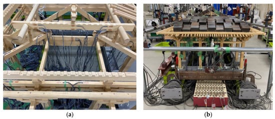 The vertical load was applied using a 1 kg iron block (100 mm × 50 mm × 25 mm), and the number of iron blocks (Figure 9b) used per square meter was calculated according to the roof area. The iron blocks were placed manually before the experiment started and unloaded at the end of the experiment in preparation for the next vertical load parameter.