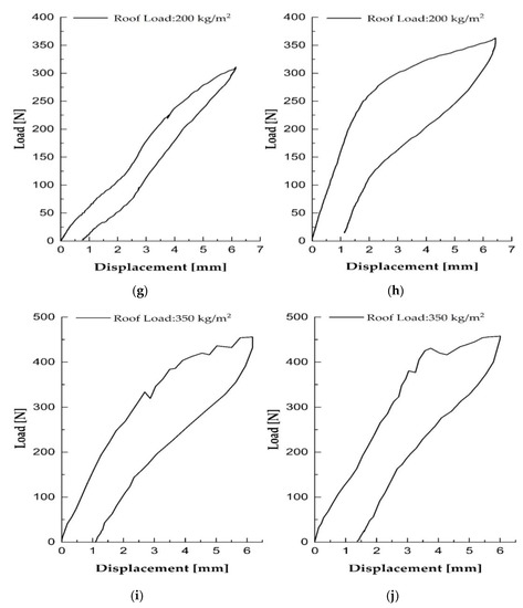 For the horizontal load test, different vertical loads of 0 kg/m2, 50 kg/m2, 100 kg/m2, 200 kg/m2, and 350 kg/m2 were set, and each was pulled in the frontal and lateral directions until the displacement to the column head was 6 mm. For the vertical load tests, only 100 kg/m2, 200 kg/m2, and 350 kg/m2 roof loads were assumed, taking into account the effect of the roof load on the deformation of the building components, and each roof load test was carried out for a period of two hours from the placement of the load, after which the load was unloaded to restore the components to their previous states in terms of deformation.